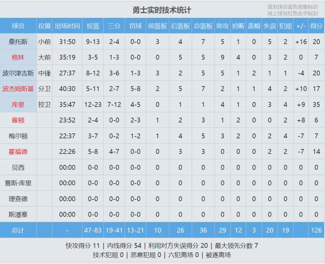 追梦生生抢断伦纳德,第四节把小卡锁死了。快船大势已去,全场结束,勇士126-121淘汰快船,末节勇士狂轰43分,下一场对阵太阳。库里三分12中7,轰下35分4助攻。桑托斯和波神各砍20分,波杰17+7,霍福德砍下14分。