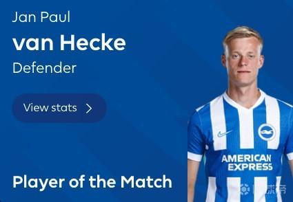 防守稳健,范赫克当选布莱顿vs切尔西全场最佳球员
