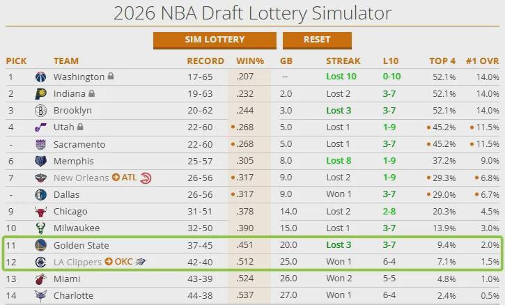北京时间4月17日,NBA选秀网站晒出雷霆状元签概率。快船2026年首轮签在雷霆手里,由于快船附加赛出局,目前雷霆有1.5%的概率抽中状元签,7.1%的概率抽到前四顺位。如果明天勇士战胜太阳,雷霆有2%的概率抽中状元签。
