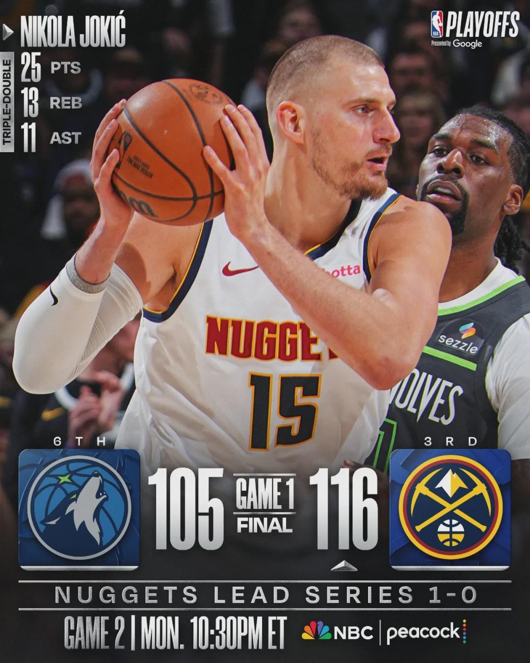 约基奇和穆雷8季后赛同场砍下25+5+5,追平乔丹和皮蓬,并列NBA季后赛历史第一。4月21日上午10点半,系列赛G2,掘金继续主场迎战森林狼。