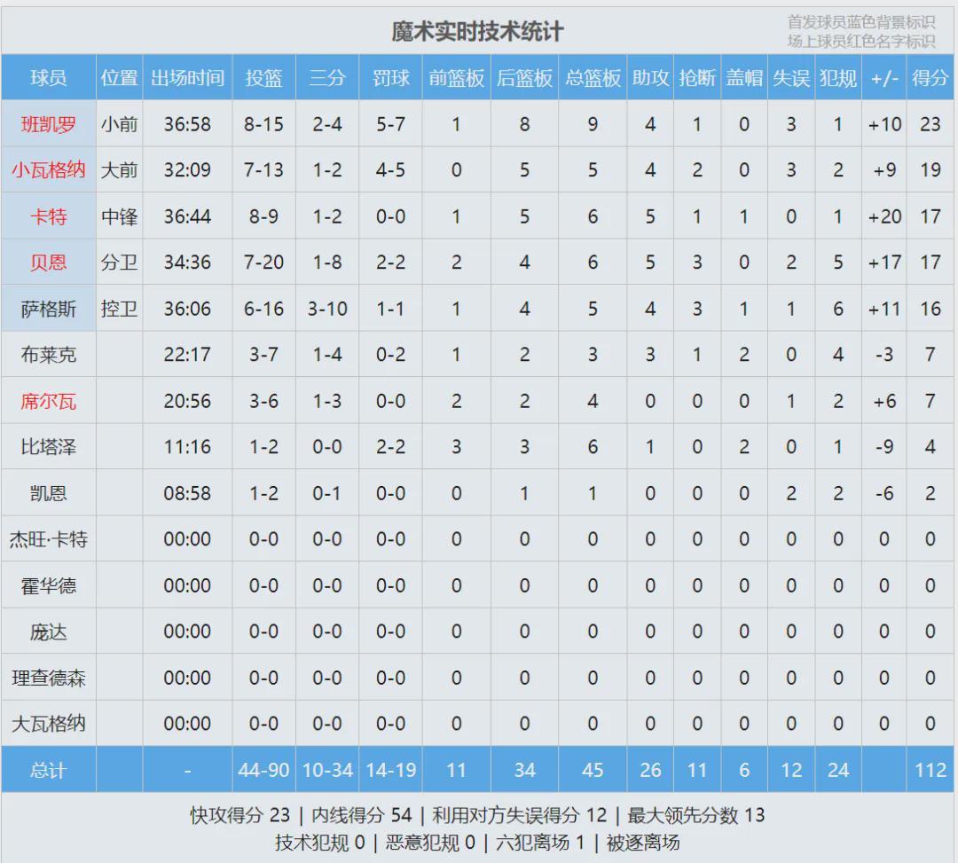 杜伦彻底迷失了,前三节4中3仅得7分5篮板3失误,被魔术不断冲击内线!第四节杜伦依然毫无存在感,小瓦格纳站出来跟坎宁安对飙。末节最后3分钟,魔术依然领先10分。全场结束,魔术112-101力克活塞,魔术1比0领先活塞。