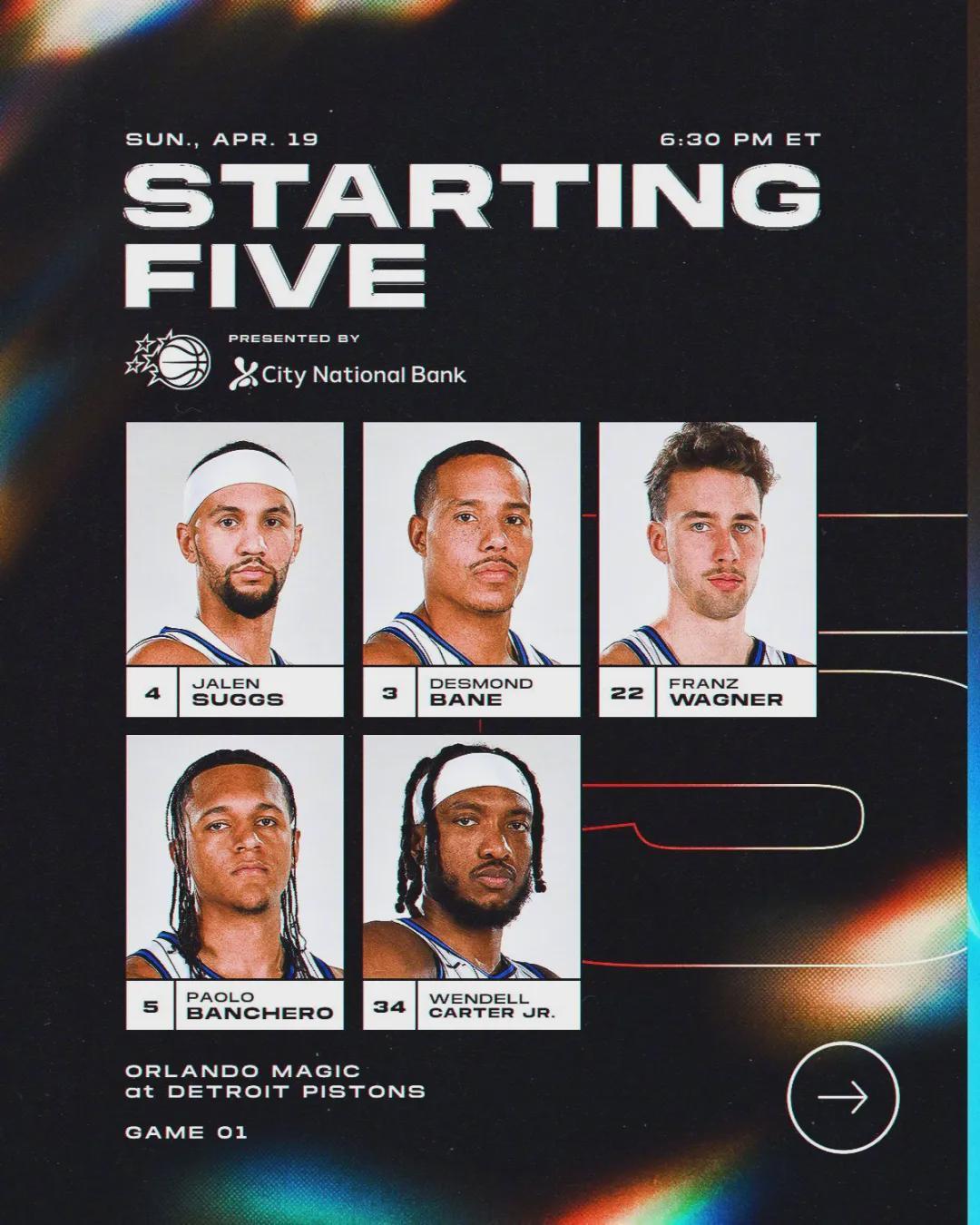 活塞首发:坎宁安、邓罗、哈里斯、奥萨尔-汤普森、杰伦-杜伦。常规赛收官阶段,坎宁安因为气胸连续缺席了11场比赛。复出后打了3场,三分球合计11中2。今天第一节开打之后,魔术多点开花,开局轰出18-5拉开到两位数。