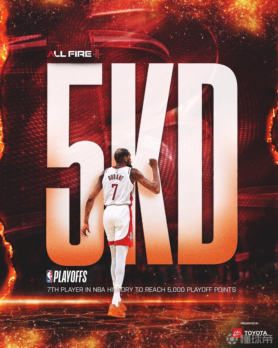 在第二节比赛中,杜兰特凭借一记急停抛投2+1,实现季后赛生涯总得分突破5000分大关,成为NBA历史第七位季后赛5000分先生,同时与勒布朗-詹姆斯成为现役唯二达成该里程碑的球员。