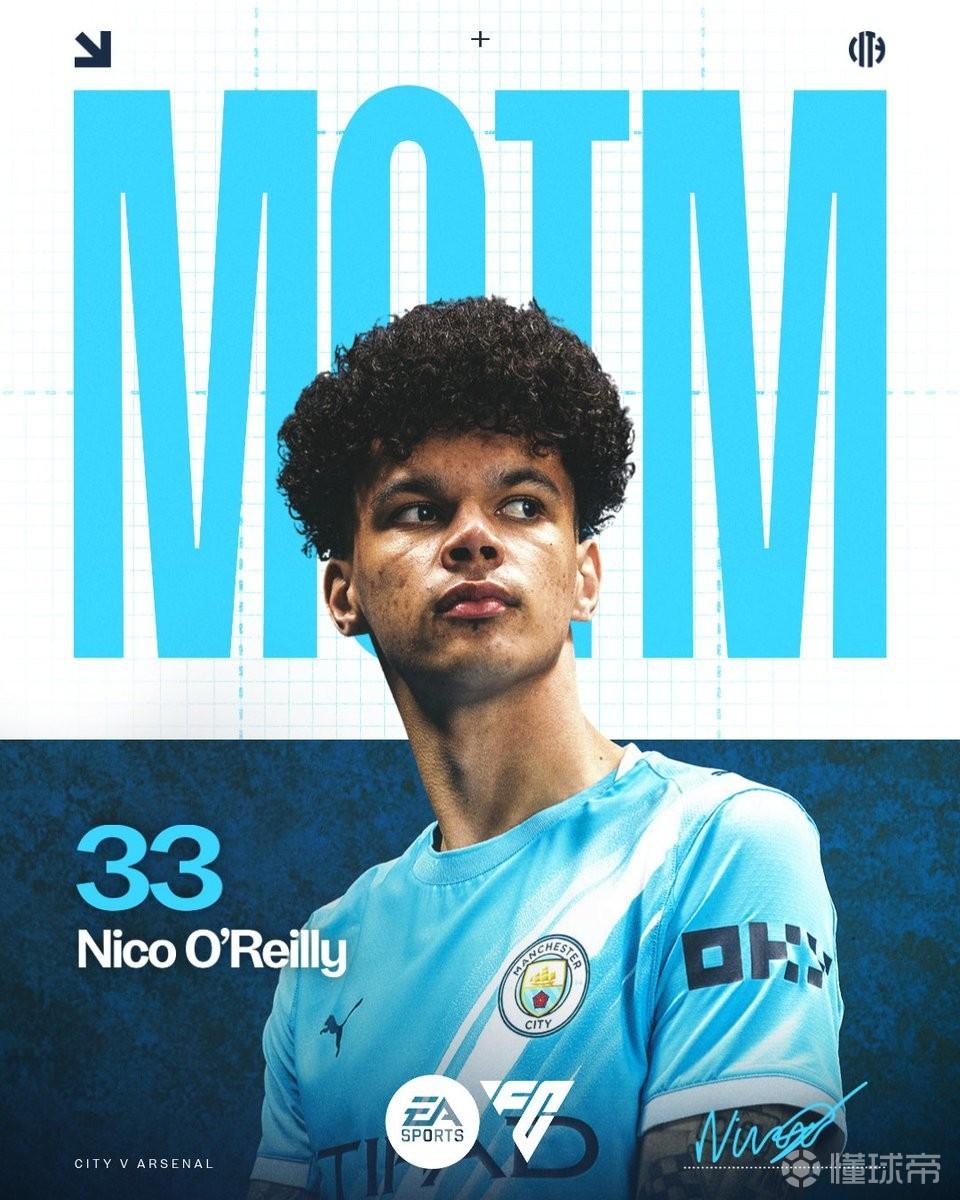 曼城官方:尼科-奥赖利当选与阿森纳一役队内最佳球员