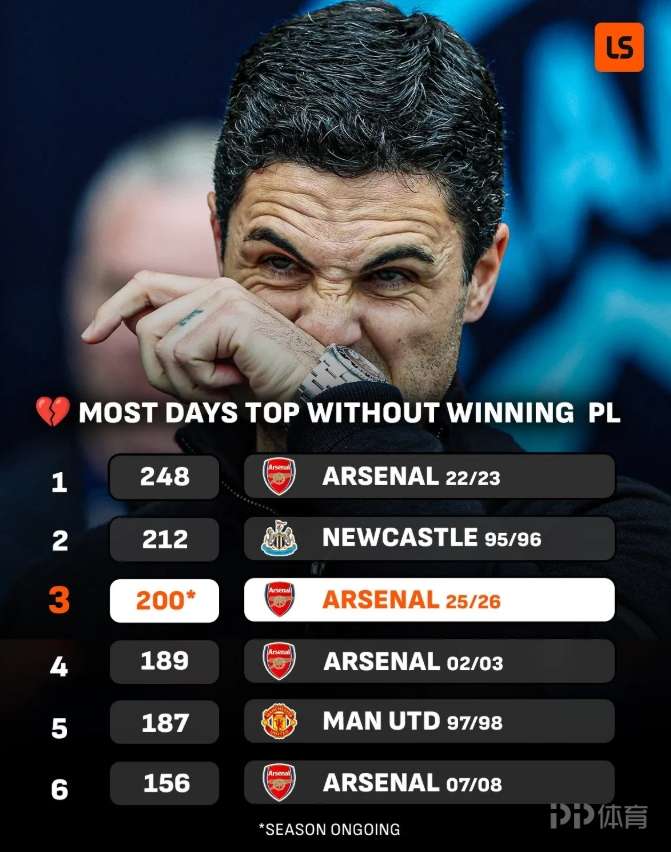 英超领跑天数最多却未能夺冠排行:阿森纳本季第3 第一也是枪手 发布时间:2026-04-24 01:21:00 | 浏览: 次 直播信号源 体育直播专业赛事解说 免费直播 4k超清直播 美女专业解说(无插件) 阿森纳本赛季在榜首停留了200天,却在昨晚跌落至次席。据LiveScore的数据显示,如果本赛季最终未能夺冠,他们将可能成为英超历史上“领跑天数最多却未能夺冠”的第三悲情球队 。 责任编辑: 体育24小时热点 标签: 体育 PP体育 聚力体st育 英超直播 西甲 亚冠直播 欧冠直播 德甲直播 欧联杯 CBA 篮球直播 WWE直播 UFC直播 体育直播