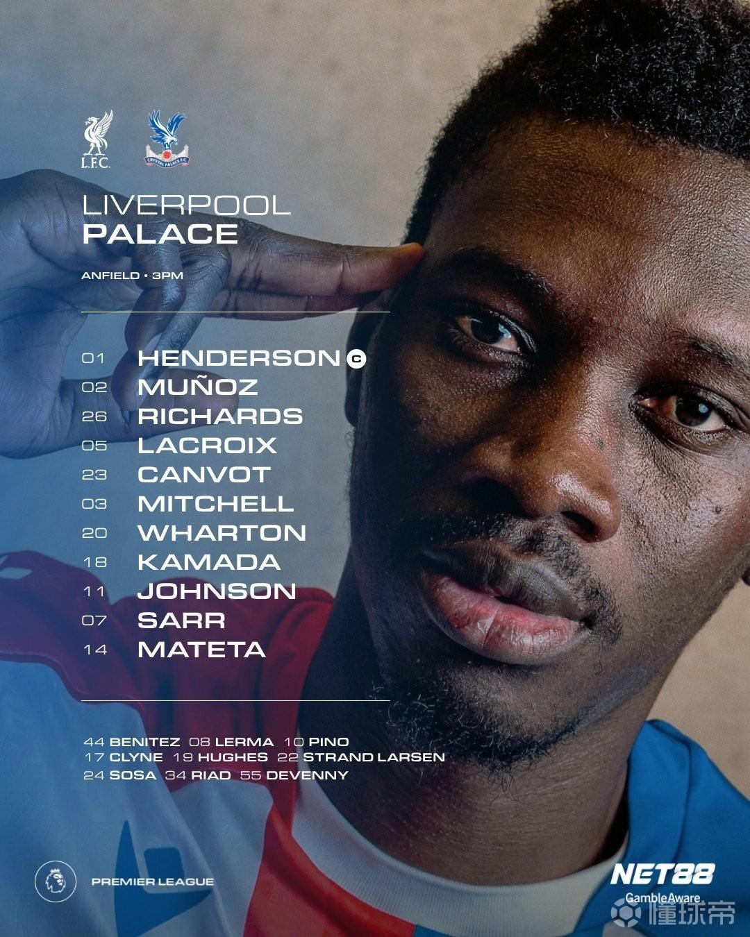 水晶宫首发:1-迪恩-亨德森、23-康沃、5-拉克鲁瓦、26-克里斯-理查兹、2-穆尼奥斯、20-亚当-沃顿、18-镰田大地、3-米切尔、11-布伦南-约翰逊、14-马特塔、7-伊斯梅拉-萨尔