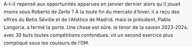 他是否重新考虑过今年一月在德泽尔比麾下出场时间减少时出现的机会?在冬季转会窗口关闭前,他收到了来自皇家贝蒂斯和马德里竞技的报价,奥巴梅扬母亲是西班牙人,他也希望重返西班牙,但时任主席隆戈里亚否决了所有转会。可以肯定的是,这位在2023-2024赛季各项赛事中攻入30球的明星球员,正在经历他在马赛的第二个赛季,而这个赛季对他来说更加艰难——尽管他目前13球10助攻的数据对于一名老将还是可圈可点。
