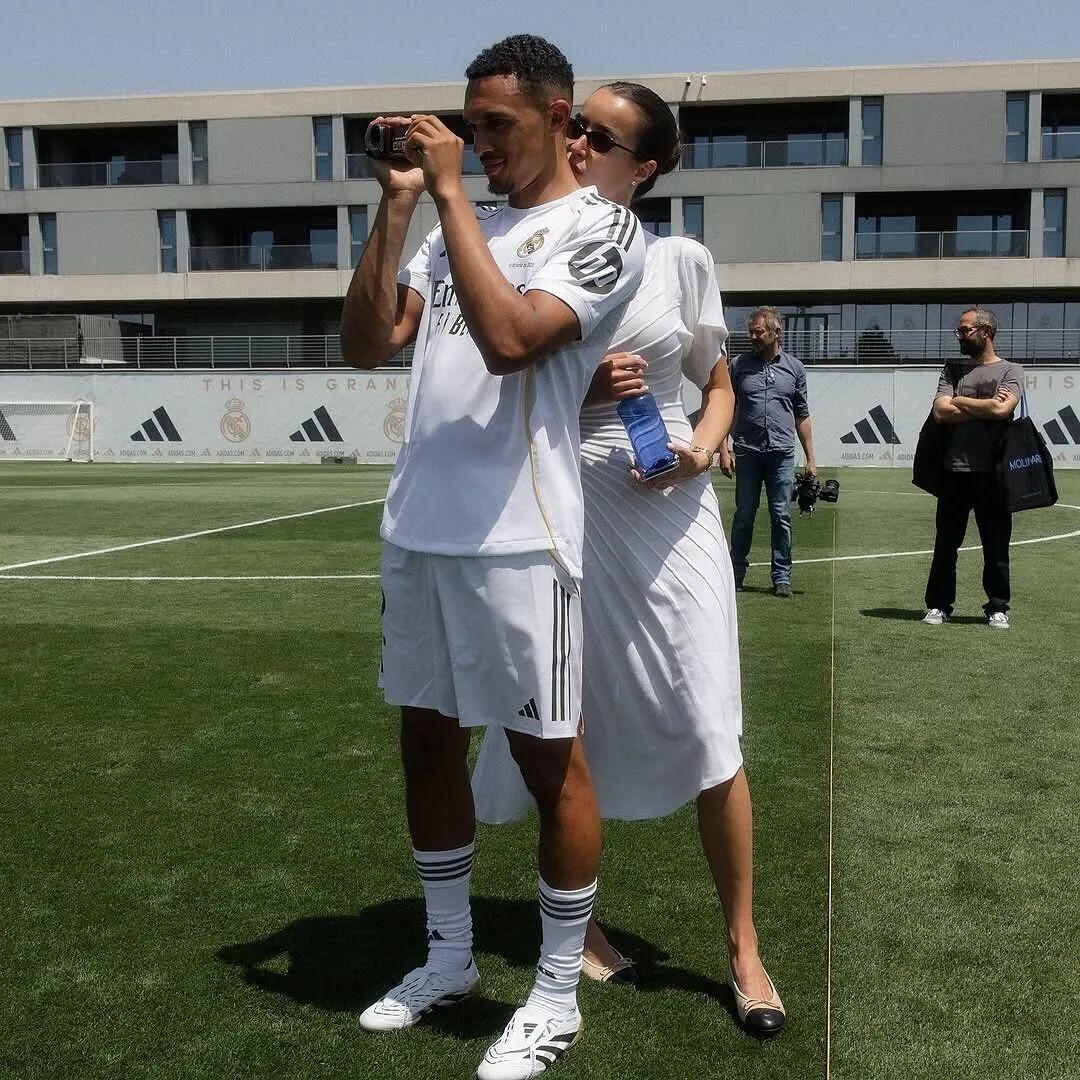 尽管此时的亚历山大-阿诺德,与利物浦的剩余合同仅以月计,也正面临着球员生涯最重要的一次抉择,但迟迟不肯流露去向的他,和埃丝特尔的感情世界倒是格外丰富。从威尼斯到巴巴多斯,从夏天到冬天,这对情侣几乎形影不离。而在去年夏天亚历山大-阿诺德加盟皇马的新闻发布会上,他也延续了队友们的“女友宣”,一席华服的埃丝特尔与亚历山大-阿诺德一同亮相,着实般配。尽管在西甲起步阶段不算顺遂,但埃丝特尔的跟随一直不离不弃,但凡赶上皇马主场比赛,埃丝特尔也经常现身看台为亚历山大-阿诺德加油。