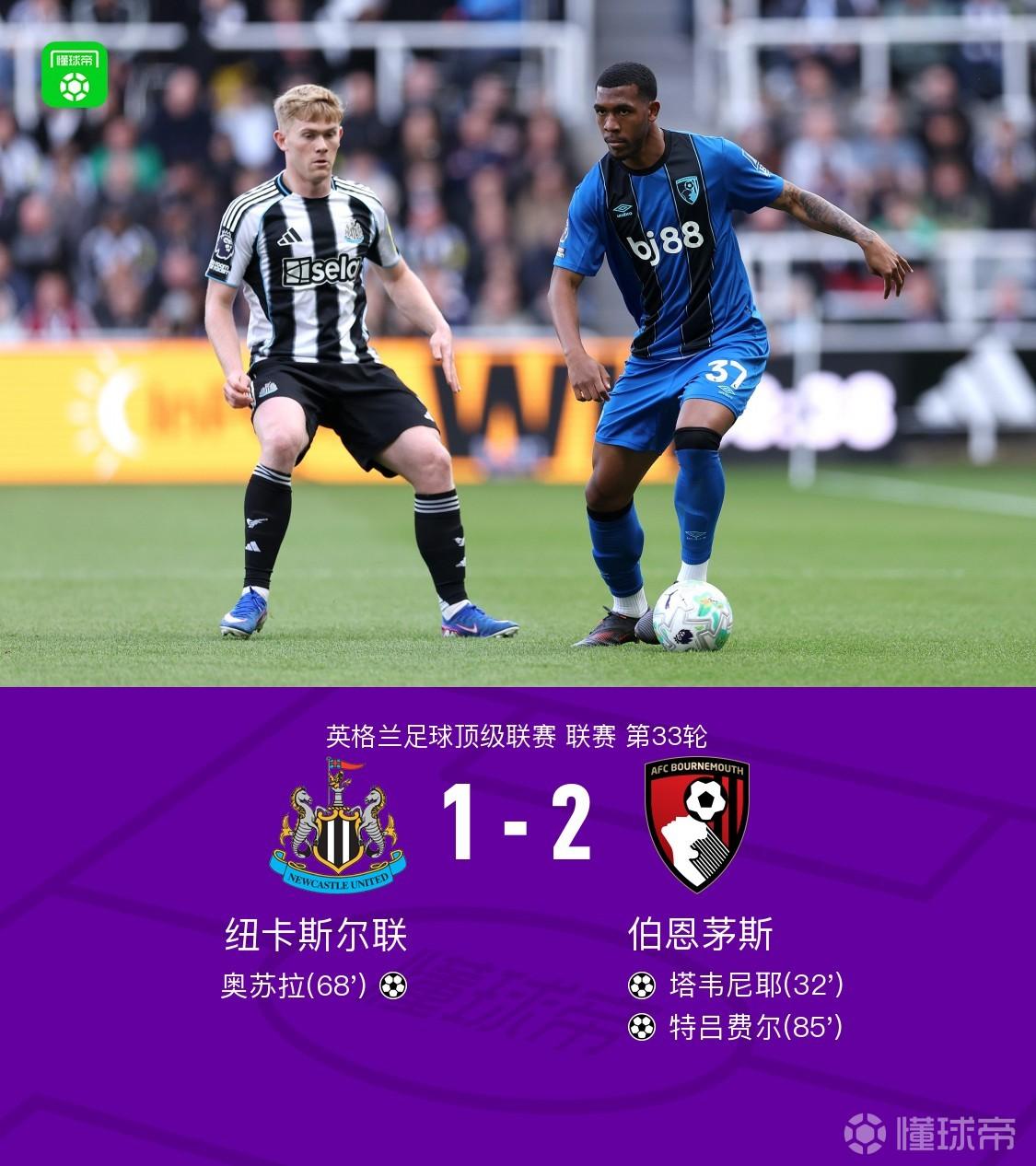北京时间4月18日英格兰足球顶级联赛 第33轮,纽卡斯尔联主场对阵伯恩茅斯。上半场塔韦尼耶率先破门,下半场埃万尼尔松乌龙助攻奥苏拉扳平,,比赛最后阶段埃万尼尔松又头球助攻特吕费尔绝杀。最终比分纽卡斯尔联 1-2 伯恩茅斯。