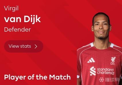 英超第33轮,利物浦客场2-1击败埃弗顿,此役打入绝杀进球的利物浦后卫范戴克当选全场最佳球员。