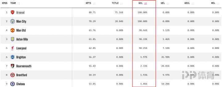 据OPTA官网数据,阿森纳、曼城、维拉、曼联以及利物浦以绝对优势排在前五,切尔西概率仅为1.45%。