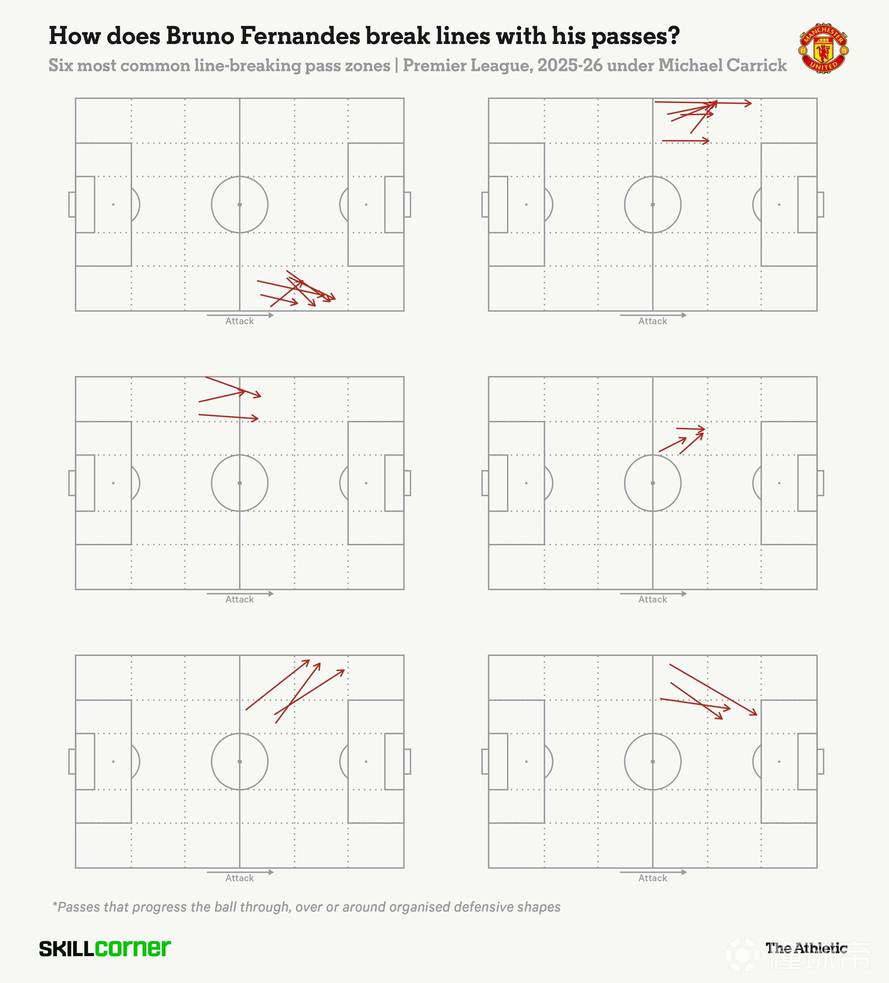 后者在他的最具穿透性传球中尤为明显——这类传球被定义为能够穿过、越过或绕过防守屏障来推进皮球。利用SkillCorner的数据可见,在卡里克执教下的英超比赛中,费尔南德斯最常送出的两记穿透性传球分别发生在右翼和左翼。