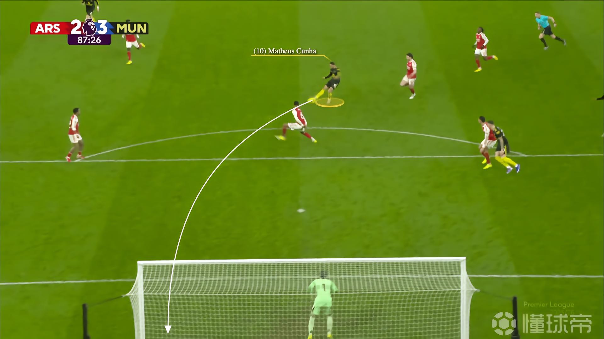 费尔南德斯控下球后,库尼亚向内冲刺,插入阿森纳中场线与防线之间的区域。