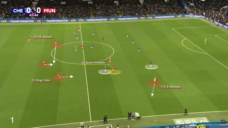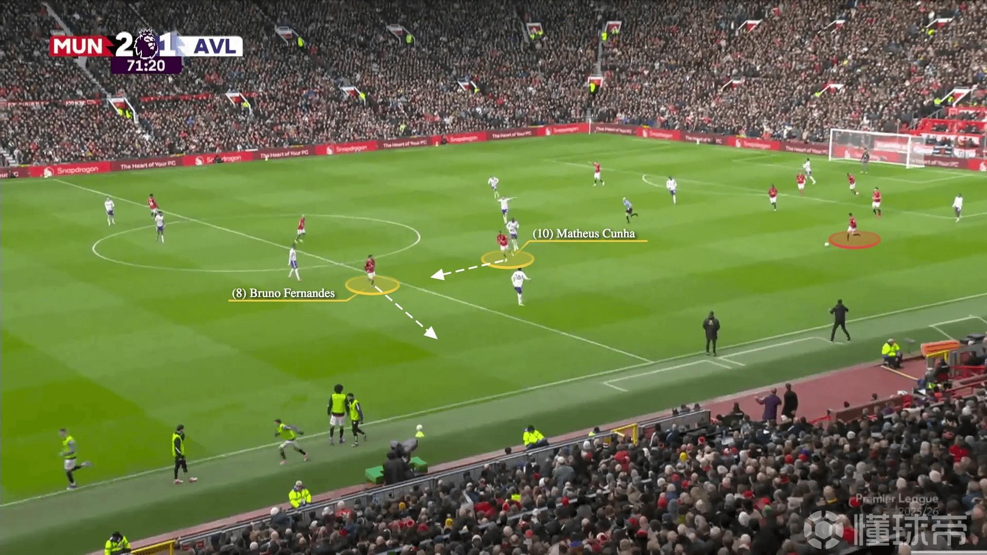 在3月15日老特拉福德3比1战胜阿斯顿维拉的例子中,曼联发动反击,费尔南德斯与库尼亚交换位置。